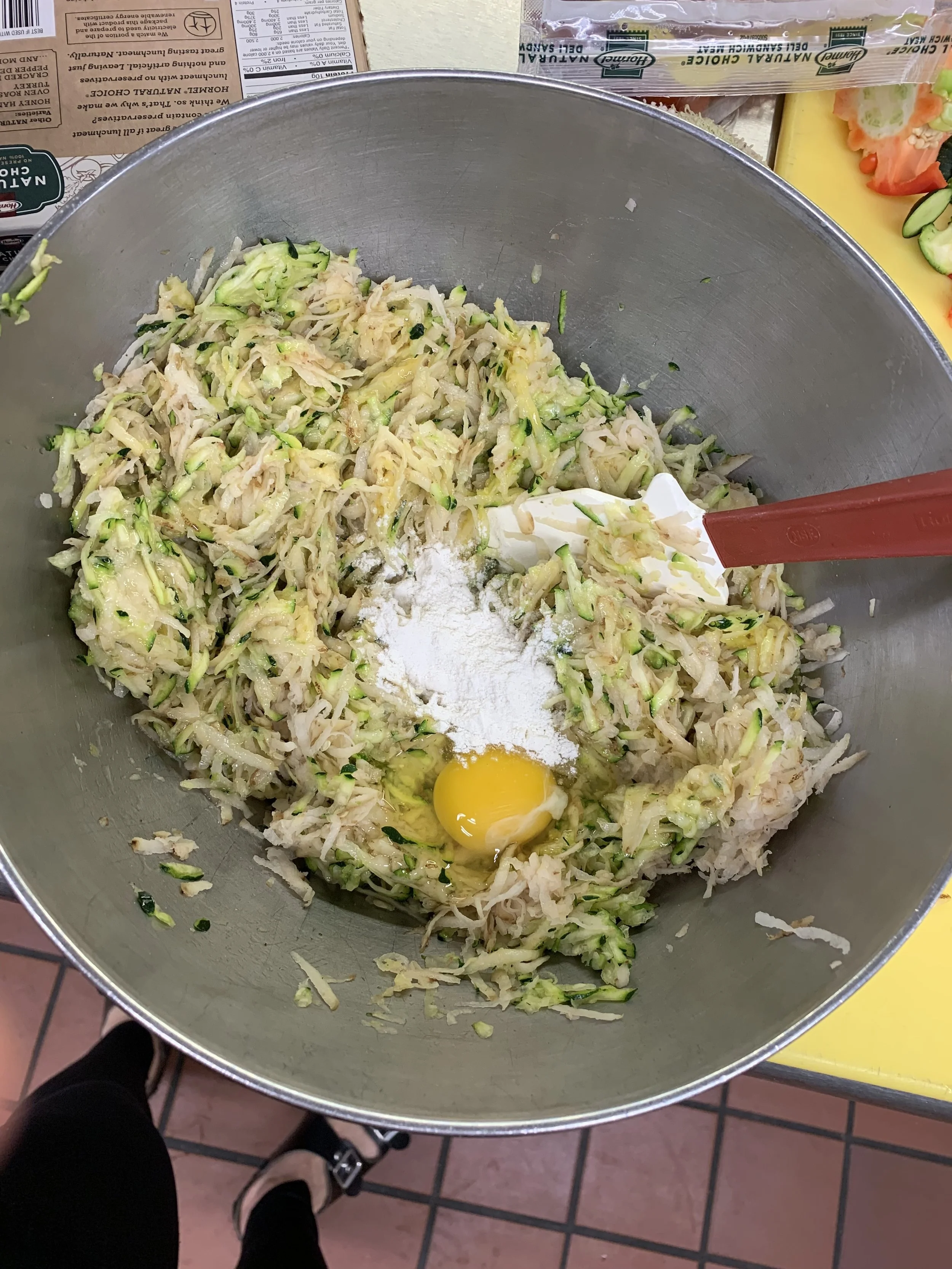 At first I thought of maybe doing a fritter type crust, but didn’t want all the oil. So I chose baking. The labor intensive part came next with using a cheese grater to shred two medium zucchinis and two Russet potatoes. My arms were sore after that. I wished I’d had a mandolin or a food processor, but alas. Sore forearms it was. Then to continue to the workout that this meal became, I put the zucchini and potato shreds in a towel and squeezed all the excess liquid out. Then I mixed in four eggs, a quarter cup of gluten free all purpose flour, and a tablespoon of salt. Once it is all combined scoop out a quarter cup at a time, squeeze out any extra liquid and place on a greased baking tray. You’ll bake these initially for about ten minutes, then take out, add toppings, and bake for another five to ten minutes. I used a very basic tomato sauce that is Low FODMAP and also Cabot Cheddar Cheese, which is lactose free!!